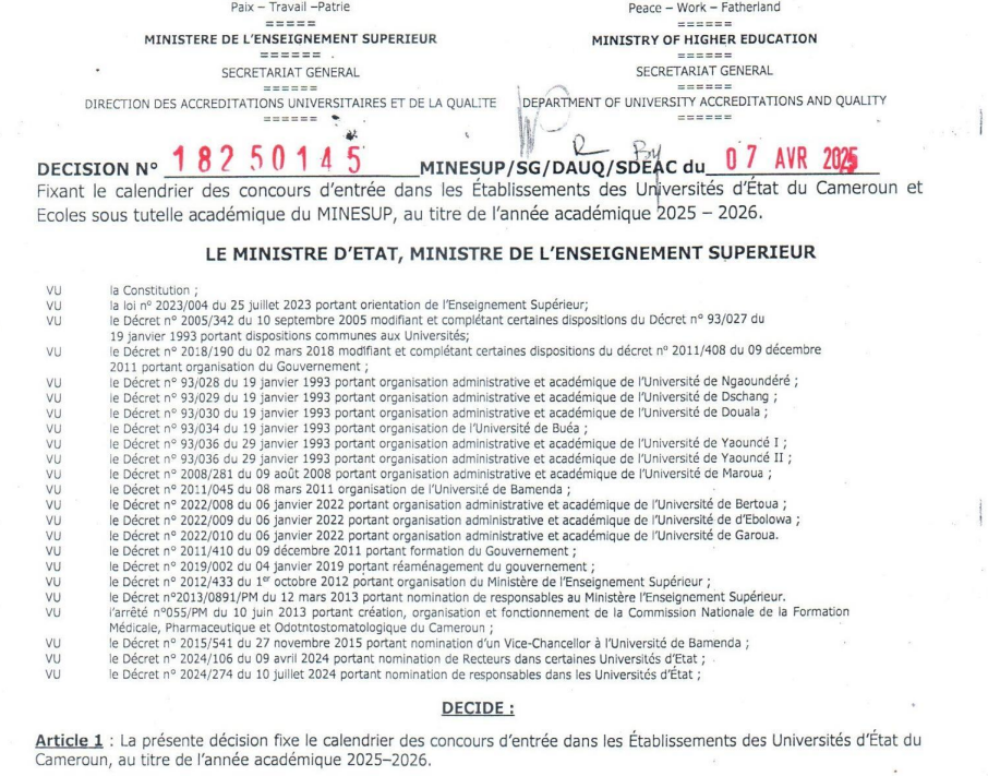Le Ministère de l’Enseignement Supérieur (MINESUP) du Cameroun a publié le calendrier officiel des concours d’entrée dans les établissements des universités d’État pour l’année académique 2025-2026. Ce document essentiel informe tous les candidats des dates clés pour réussir leur inscription et admission dans les différentes filières universitaires publiques du pays.