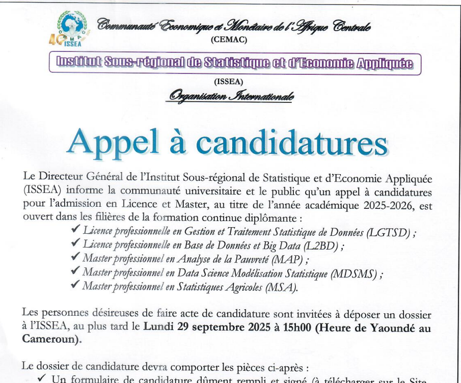Les personnes désireuses de faire acte de candidature sont invitées à déposer un dossier à l’ISSEA, au plus tard le Lundi 29 Septembre 2025 à 15h00 (Heure de Yaoundé au Cameroun), par l’une des voies suivantes :